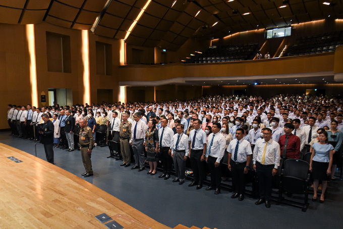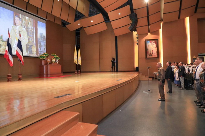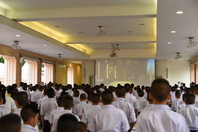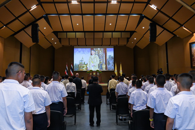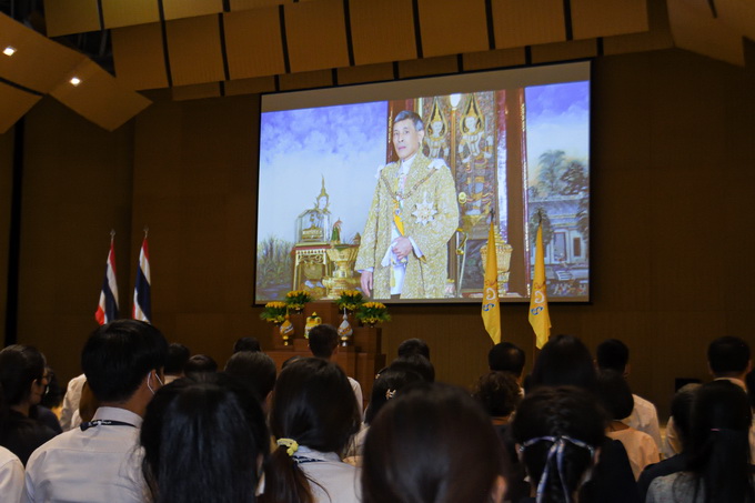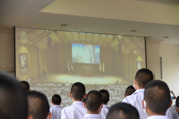 นักเรียนและบุคลากรร่วมกันร้องเพลงสรรเสริญพระบารมีและเพลงสดุดีจอมราชา
