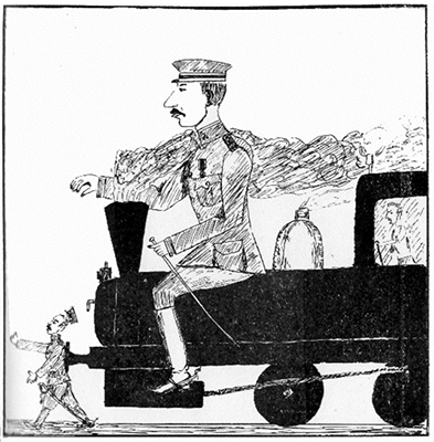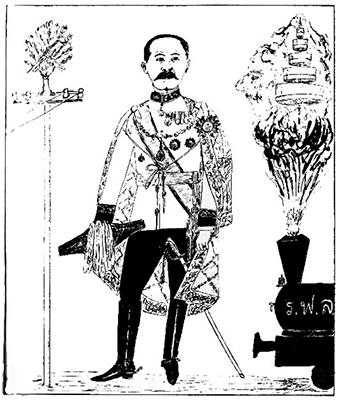 ประทับนั่งมาเหนือหัวรถจักรไอน้ำของกรมรถไฟหลวงซึ่งกำลังดุนหลังนายทหารช่างให้เดินไปข้างหน้า