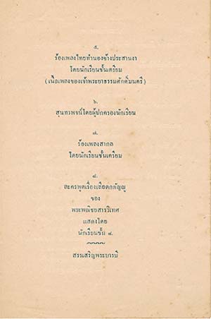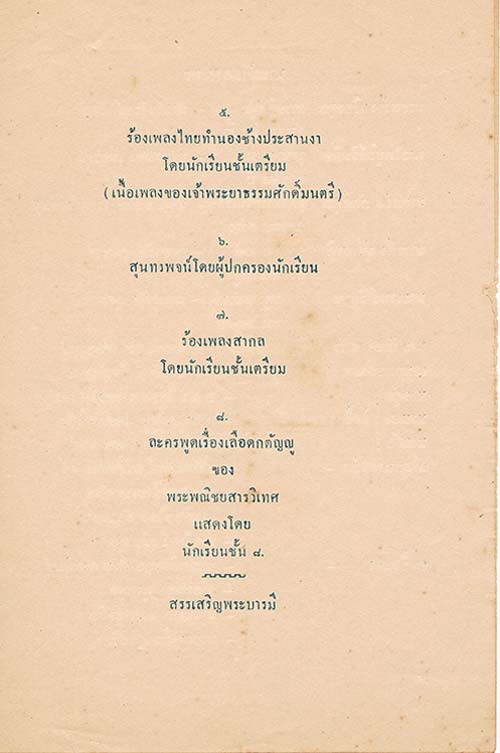 ๕. ร้องเพลงไทยทำนองช้างประสานงา โดยนักเรียนชั้นเตรียม (เนื้อเพลงของเจ้าพระยาธรรมศักดิ์มนตรี)