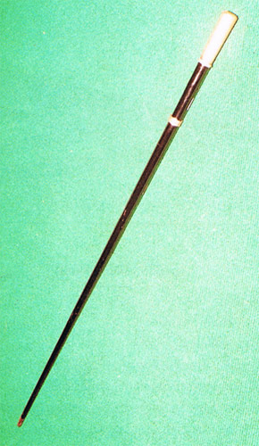 ที่หัวและปลายไม้เท้าหุ้มโลหะสีเงิน (ไม้เท้าเสือป่าเป็นโลหะสีทอง)