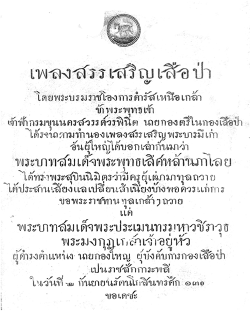 ทรงพระนิพนธ์ถวายเมื่อแรกสถาปนากองเสือป่าใน พ.ศ. ๒๔๕๔