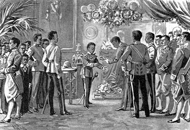 ที่มุมบนซ้ายของภาพเป็นธงช้างเผือกซึ่งเป็นธงชาติสยามในเวลานั้น
