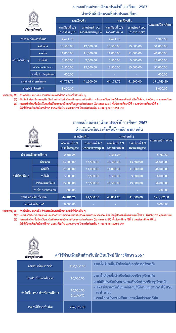 รายละเอียดค่าเล่าเรียน ประจำปีการศึกษา 2567 สำหรับนักเรียนระดับชั้นประถมศึกษา 4 - มัธยมศึกษาตอนต้น