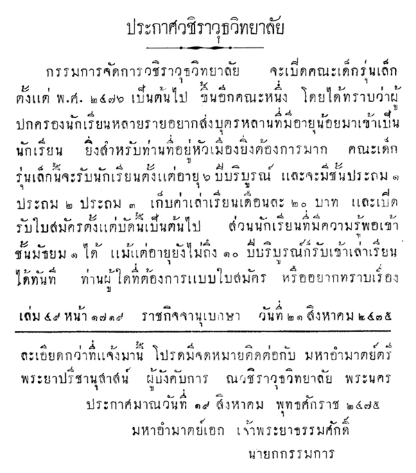 และโดยที่ใบอนุญาตให้จัดตั้งโรงเรียนวชิราวุธวิทยาลัยนั้นออกในพระปรมาภิไธยพระบาทสมเด็จพระมงกุฎเกล้าเจ้าอยู่หัว
