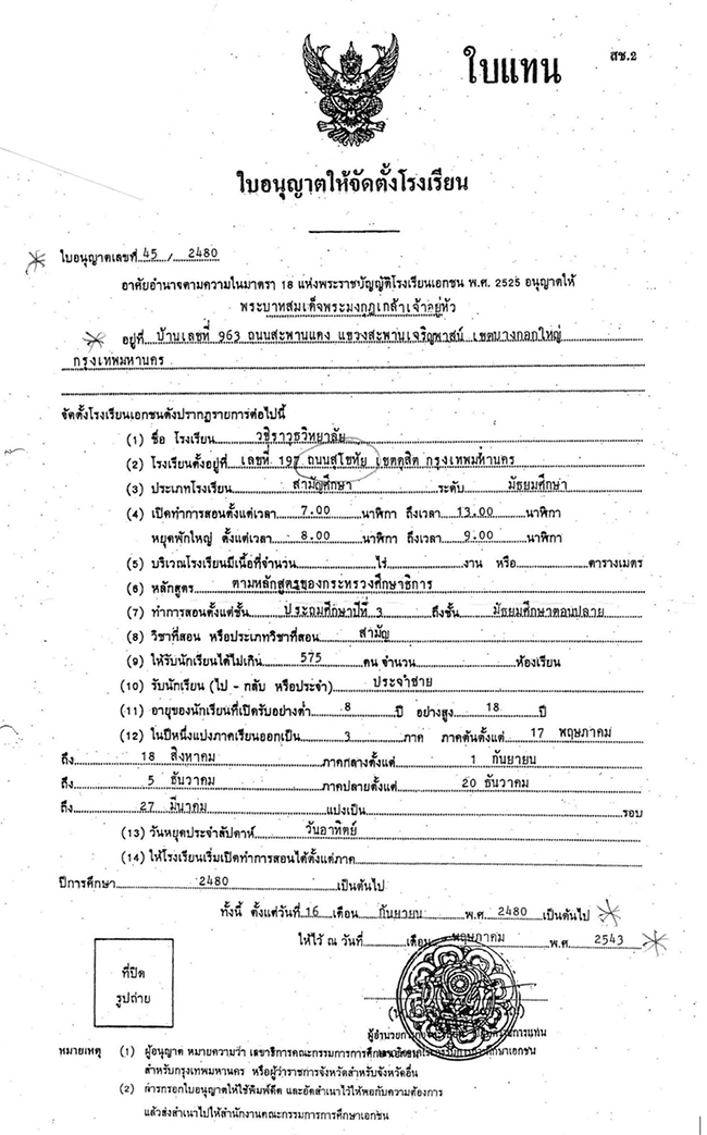รายละเอียดในใบอนุญาตจัดตั้งโรงเรียนฉบับนี้