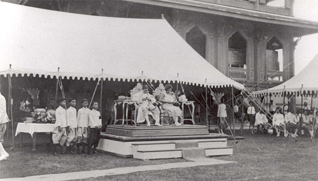 ประทับพลับพลายกข้างหอประชุมในงานประจำปีของวชิราวุธวิทยาลัย |