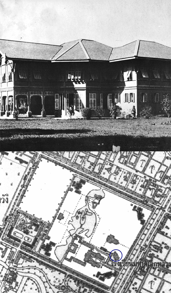 มาปลูกสร้างที่มุมด้านทิศตะวันออกเฉียงเหนือของเรือนไม้หลังคาจากที่ใช้เป็นอาคารเรียนของโรงเรียนมหาดเล็กหลวง