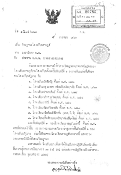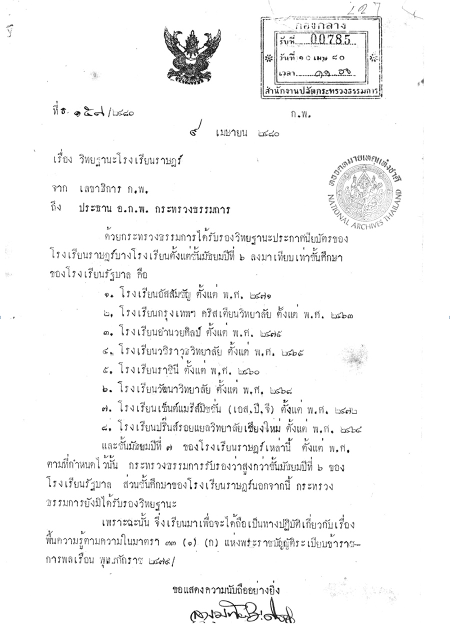 หนังสือรับรองวิทยฐานะโรงเรียนราษฎร์ที่เลขาธิการคณะกรรมข้าราชการพลเรือน