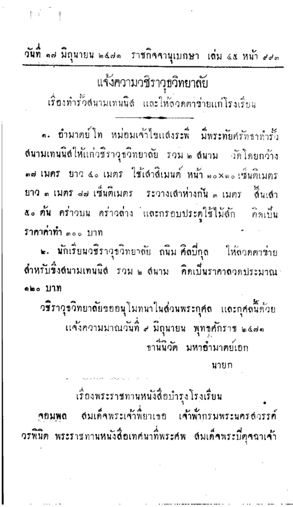 ดังมีหลักฐานปรากฏในแจ้งความวชิราวุธวิทยาลัยซึ่งลงประกาศในราชกิจจานุเบกษา