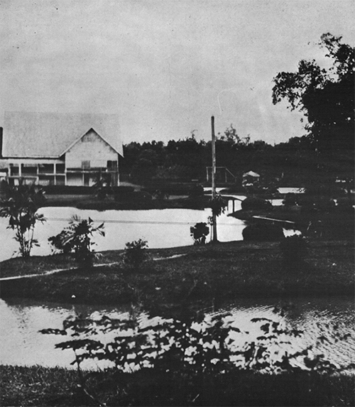 โรงสควอชมองจากเกาะกาลงสระน้ำ (ปัจจุบันเป็นที่ตั้งศาลากลางน้ำ) |