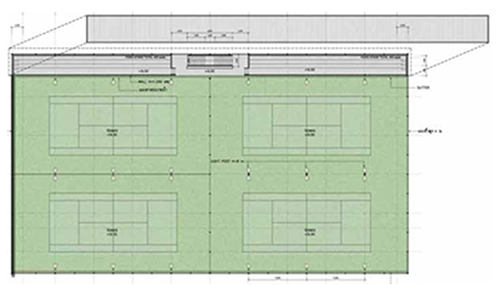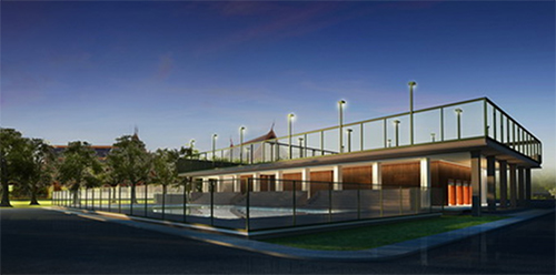 ภาพจำลองอาคารกีฬาที่กำลังก่อสร้างในพื้นที่ซึ่งเคยเป็นสนามเทนนิสและโรงซักรีด |