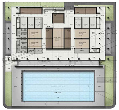 อาคารนี้ประกอบด้วยคอร์ทสควอชปร้ภทคู่ ๒ คอร์ท