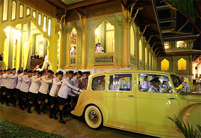 นักเรียนวชิราวุธวิทยาลัยเข็นรถพระที่นั่งส่งเสด็จ